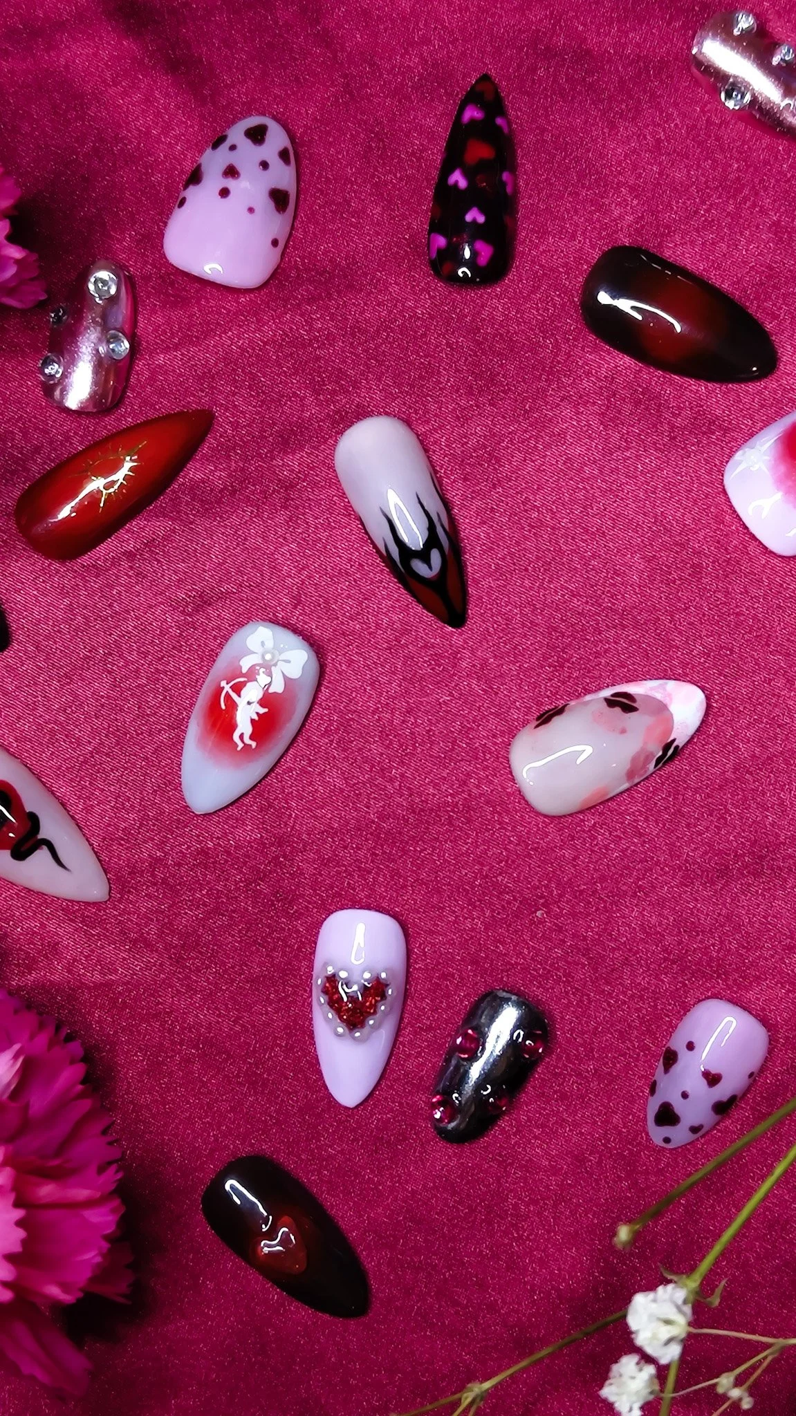 An edgy romantic baddie moment. Reds and blacks throughout, with each nail designed differently, heart details with black snakes and red cat-eye eyes, red French tips with black heart flames, black French tips with cherry hearts, layered hearts on dark bases, and bold contrast everywhere.